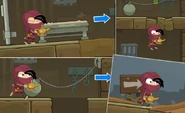 But Brutus is too good! He corners you... next to a pile of explosive barrels. You guessed it! Click the explosive barrels to roll one in his direction to knock him out. The impact will also dislodge a platform so you can climb to the top!