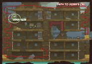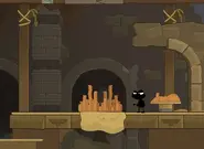 Scale up the ladder closest to the entrance and then walk along until you see solid quicksand. Throw the magic sand onto the solid quicksand and quickly run over it to sink down. Then, when you're on the level below, run to your left. You'll see solid quicksand. Throw some of the magic sand onto it. The wrecking ball on the solid quicksand will sink through and clonk out a guard on the level below. He'll drop a key. Now sink through the sand and grab the key. Now head to the left and climb down until you're on the same level as your old cell. Throw the magic sand through the bars. This'll turn the solid quicksand in your cell into wet quicksand and the wrecking ball will fall through and clonk out the guard below.