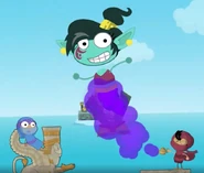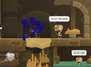 So yeah. Now follow the old guy you just freed. He'll say something like "We need a distraction!" That's your cue. Throw some of that magic sand onto the solid quicksand closest to you. The coins will sink through the quicksand and poor old Ruby Gloom will run off in search of them.