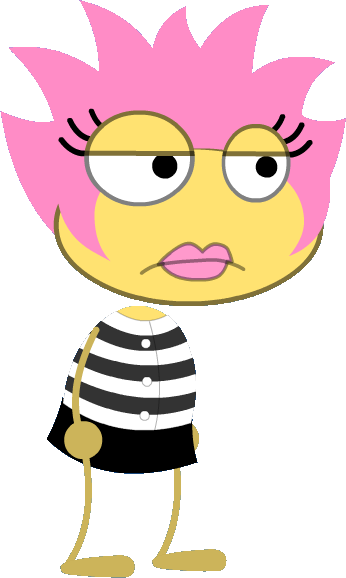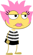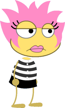 Betty Jetty has spiked pink hair and frowning pink lips. Her skin is yellow. Her outfit always consists of prisoner attire with small buttons, even when she isn't in a jailcell.