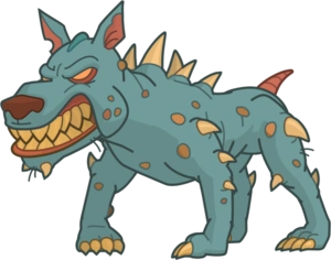 The Puerto Rico Chupacabra appears as a large, teal-blue, hairless American pitbull-wolf hybrid with bony spikes all over its body and gigantic claws and teeth.