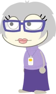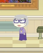 The Curator has grey hair and pale white skin that makes her look quite old, like your future self. She wears indigo-rimmed glasses and a purple dress with a lavender sweater. She always wears a museum pass around her neck.