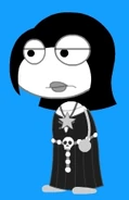 She has a creepy appearance. She has short black hair with hair fringe on both sides of her face. She has pale white skin and wears grey lipstick on her mouth. Her dress is black, and she seems to wear a white shirt on the inside, and her top of the dress is split a bit in the middle, but being connected by crossed grey laces, and the bottom of her dress has grey stripes. She also wears a black necklace with black star pendant. She wears a grey belt around her waist that has a pattern: grey stripe, white sphere, and it has skull decoration in the middle.