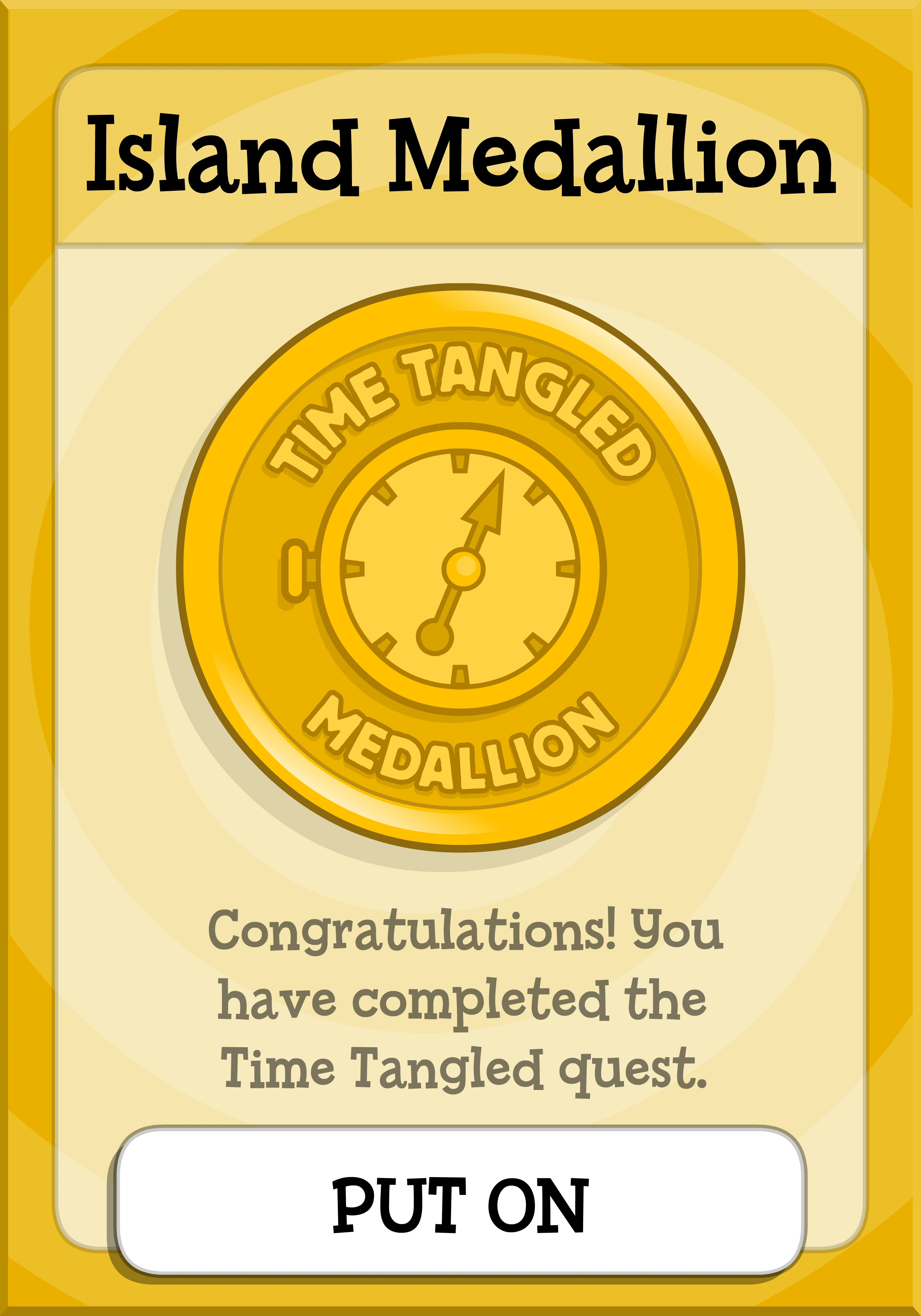 The Time Tangled Island Medallion is an item that can be obtained in Time Tangled Island. It is awarded to you by your future self after you fix the timeline. The medallion can be worn around your neck. It serves no purpose, and is purely cosmetic.