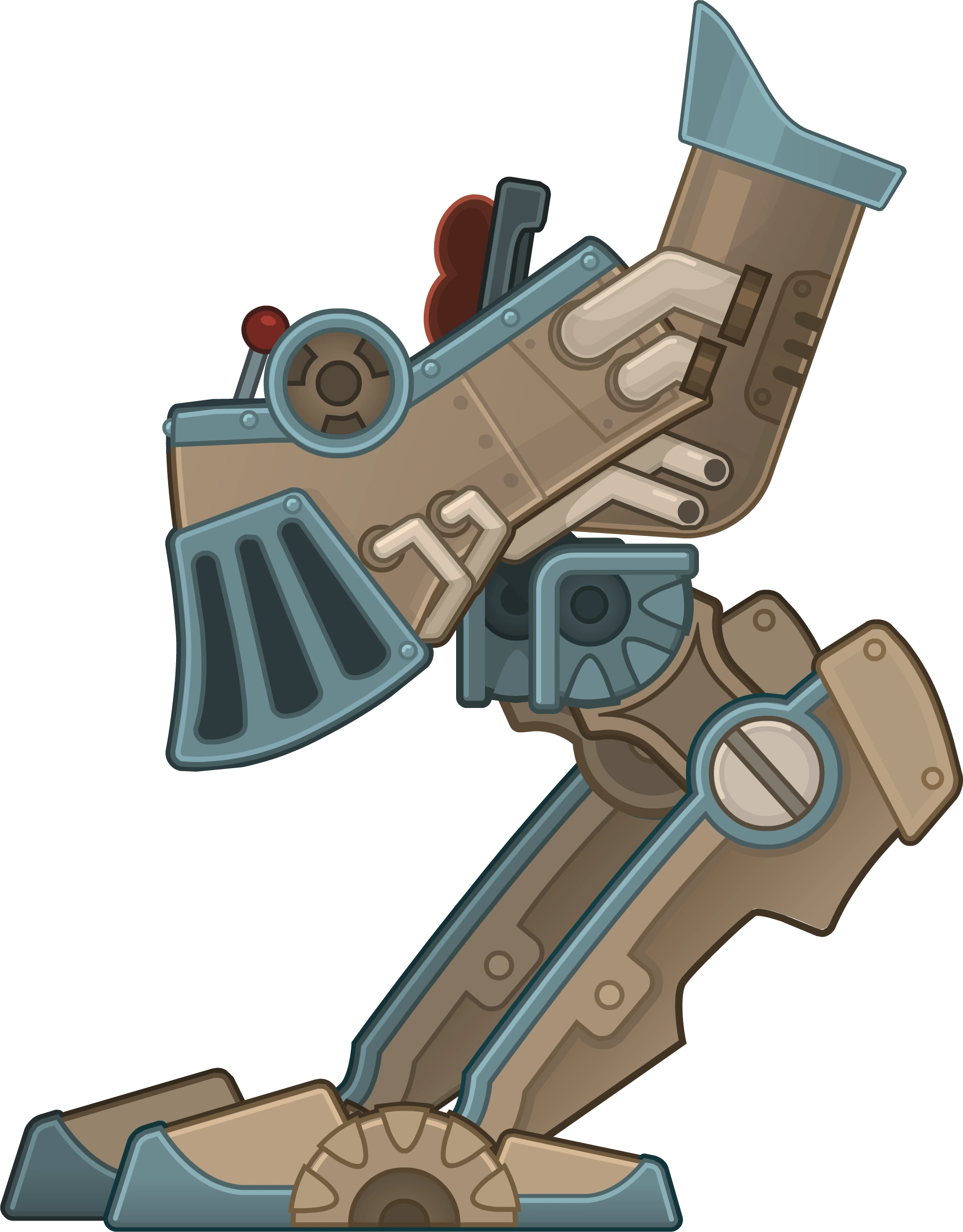 The Mech appears to be an enormous pair of mechanical legs connected to a cockpit. The ground trembles under its feet whenever it lands, whether from jumping or falling off a ledge.
