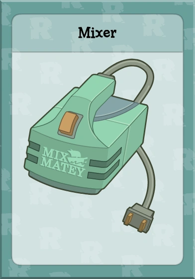 The Mixer is an item on Escape from Pelican Rock Island. It belongs to Flambe, and it can only be obtained after you change the vents in the dining room. You must turn on the fan and mix the potatoes, causing them to land on Florian Fosbury, who gets mad and starts throwing food everywhere. Flambe will run out to stop Florian, but get knocked back and drop his mixer. You can then run out and pick it up, and Flambe will let you keep it.