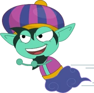 In this form, Samhal still looks pretty much the same, albeit with human features. He lacks the long ears that he had in his genie form, and his trail was replaced by legs. He still has the vest top, but now has a dark blue belt instead of a yellow one. He has dark hair and pale brown skin.