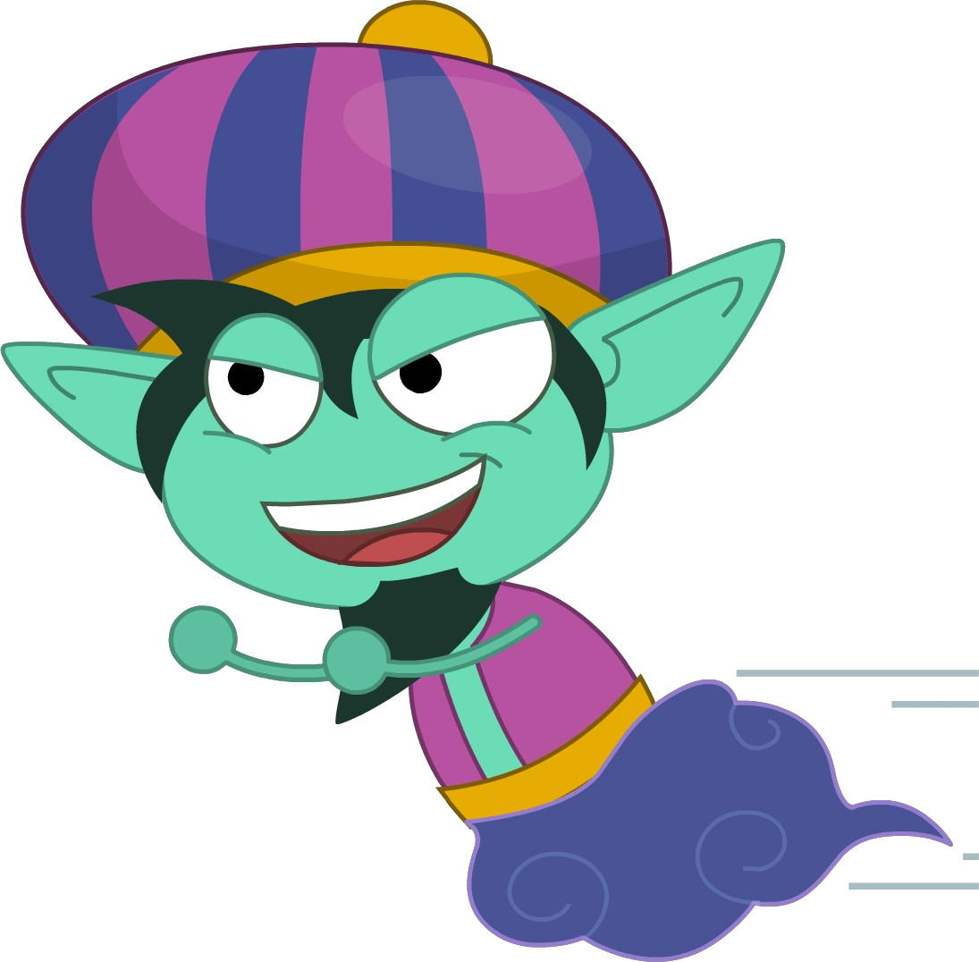 Samhal is a genie with turquoise skin and a short dark green beard. He has long ears. He wears a pink-purple 'vest' with a yellow belt, and a big pink + purple + yellow hat. He leaves a dark blue trail behind, which looks just like the particles created by Magic Sand. His eyes turn blue when he's controlled by the lamp.