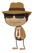 The shady cop has a stubble and wears dark sunglasses. He also wears a fedora and a trench coat. He has a scar running down his left cheek.