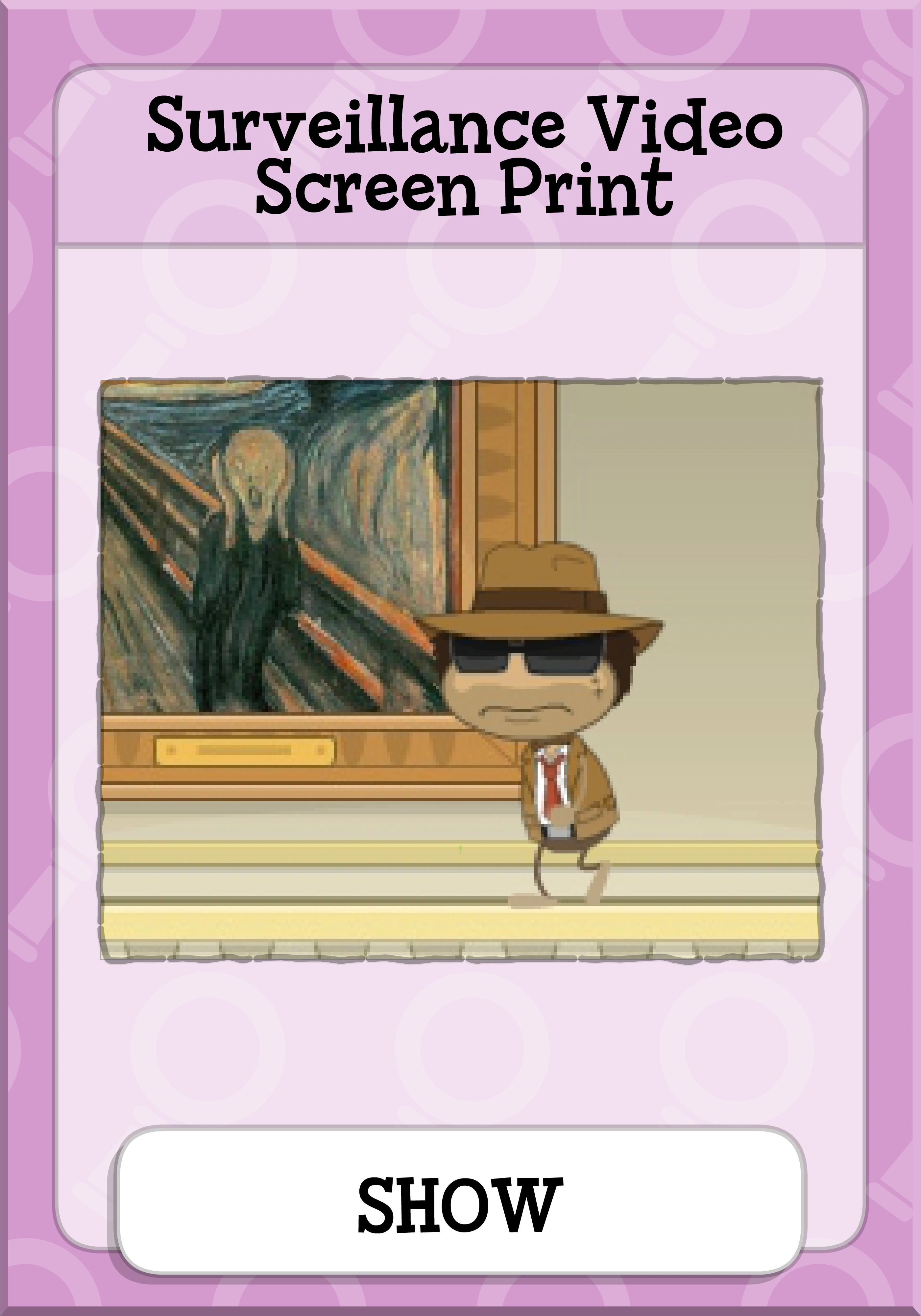The Surveillance Video Screen Print is an item on Counterfeit Island. It is obtained by pressing the "Print" button while observing camera footage in the Museum Fantastique.