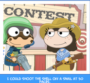Leave the town and go back to Dos Cactos. Talk to the guy with the huge head and give him the blue tulip. He will give you a scrap of paper which is half of a map to the Mustachio Gang's hideout. Go to the far left and talk to the man in white and enter the contest. In this game, you will go against different people. The object is to shoot the most targets and earn the most points. Reload if needed. Tip: to always hit the target, aim just above it. After beating the game, you will receive the spud gun.