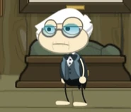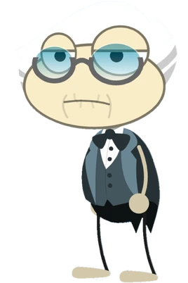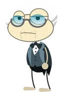 He has white hair with gray strips on the side and an old aged face with wrinkles near his mouth along with glasses and a tuxedo with a bowtie. His mouth is always closed.
